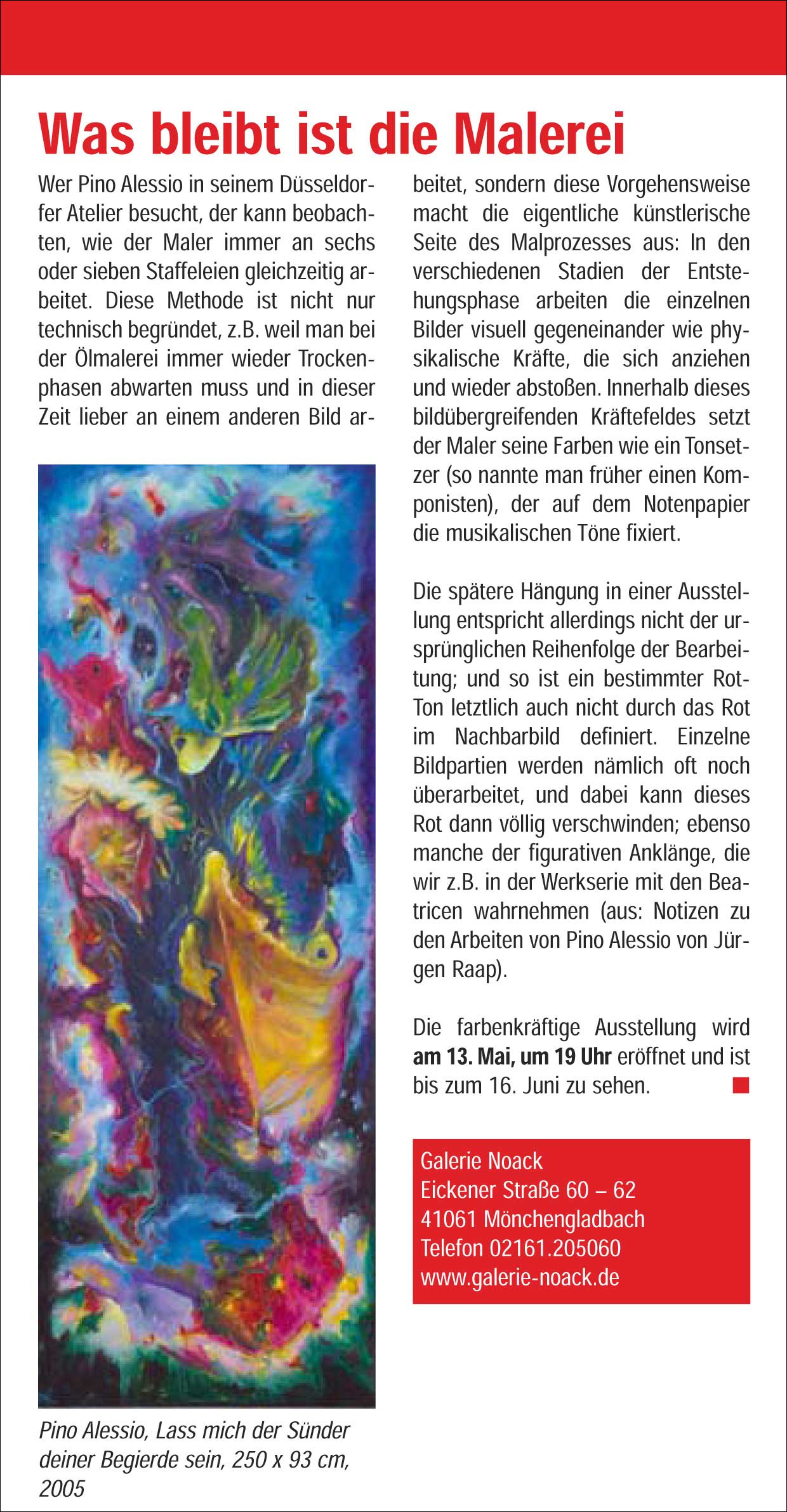 Wer Pino Alessio in seinem Düsseldorfer Atelier besucht, der kann beobachten, wie der Maler immer an sechs oder sieben Staffeleien gleichzeitig arbeitet. Diese Methode ist nicht nur technisch begründet, z.B. weil man bei der Ölmalerei immer wieder Trockenphasen abwarten muss und in dieser Zeit lieber an einem anderen Bild arbeitet, sondern diese Vorgehensweise macht die eigentliche künstlerische Seite des Malprozesses aus: In den verschiedenen Stadien der Entstehungsphase arbeiten die einzelnen Bilder visuell gegeneinander wie physikalische Kräfte, die sich anziehen und wieder abstoßen. Innerhalb dieses bildübergreifenden Kräftefeldes setzt der Maler seine Farben wie ein Tonsetzer (so nannte man früher einen Komponisten), der auf dem Notenpapier die musikalischen Töne Fixiert.