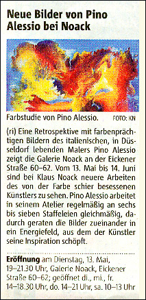 Doch die bloße Freude an der Farbe allein würde diese Malerei noch nicht rechtfertigen, und Pino Alessio ist ja auch kein ungestüm – expressiver Maler, sondern er breitet in einem sehr präzisen Bildaufbau Metaphern und Parabeln aus, die freilich nicht als Illustration einer literarischen Vorlage zu missverstehen wären.