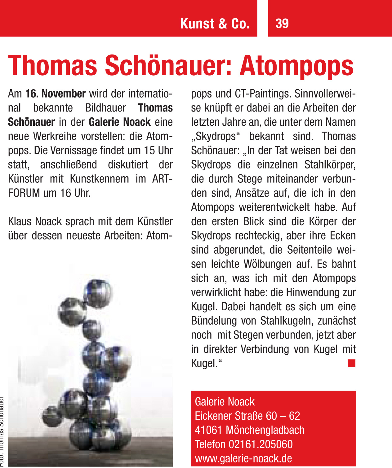 Mit Thomas Schönauer diskutieren: Ursula Lytton, M.A., Kunsthistorikerin, Stefan Lindauer, Photograph, Klaus Springer, Architekt, Klaus Noack, Galerist. Die Moderation hat Regine Müller, Kulturjournalistin (RP-Düsseldorf). |