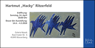 unsere neue Ausstellung widmet sich dem Werk von Hartmut „Hacky“ Ritzerfeld. Geboren wurde er 1950 in Stolberg, heute lebt er zurückgezogen in der Eifel. Er studierte an der Kunstakademie Düsseldorf bei den Professoren Kneidl und Beuys, bei dem er auch Meisterschüler war. In den Jahren 1980 bis 1990 war er die zentrale Figur der Eifelmaler, fand in der Eifel und besonders im Aachener und Heinsberger Raum eine große (Sammler-)Gemeinde. Ein Sammler stellte uns einen kleinen Teil seiner Sammlung zur Ausstellung und zum Verkauf zur Verfügung. Ihm sei an dieser Stelle gedankt.